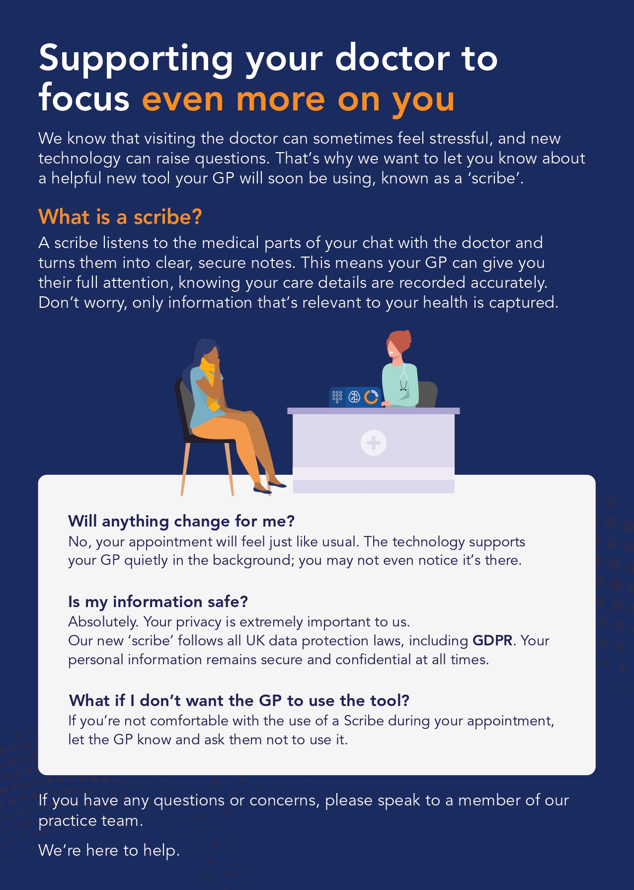 You can contact a doctor, nurse or other healthcare professional by using our online triage system called Accurx. If you struggle to use online services for any reason, receptionists are still available to help submit the request form for you. If you can use online services, please leave the phone lines free for those who can’t.
